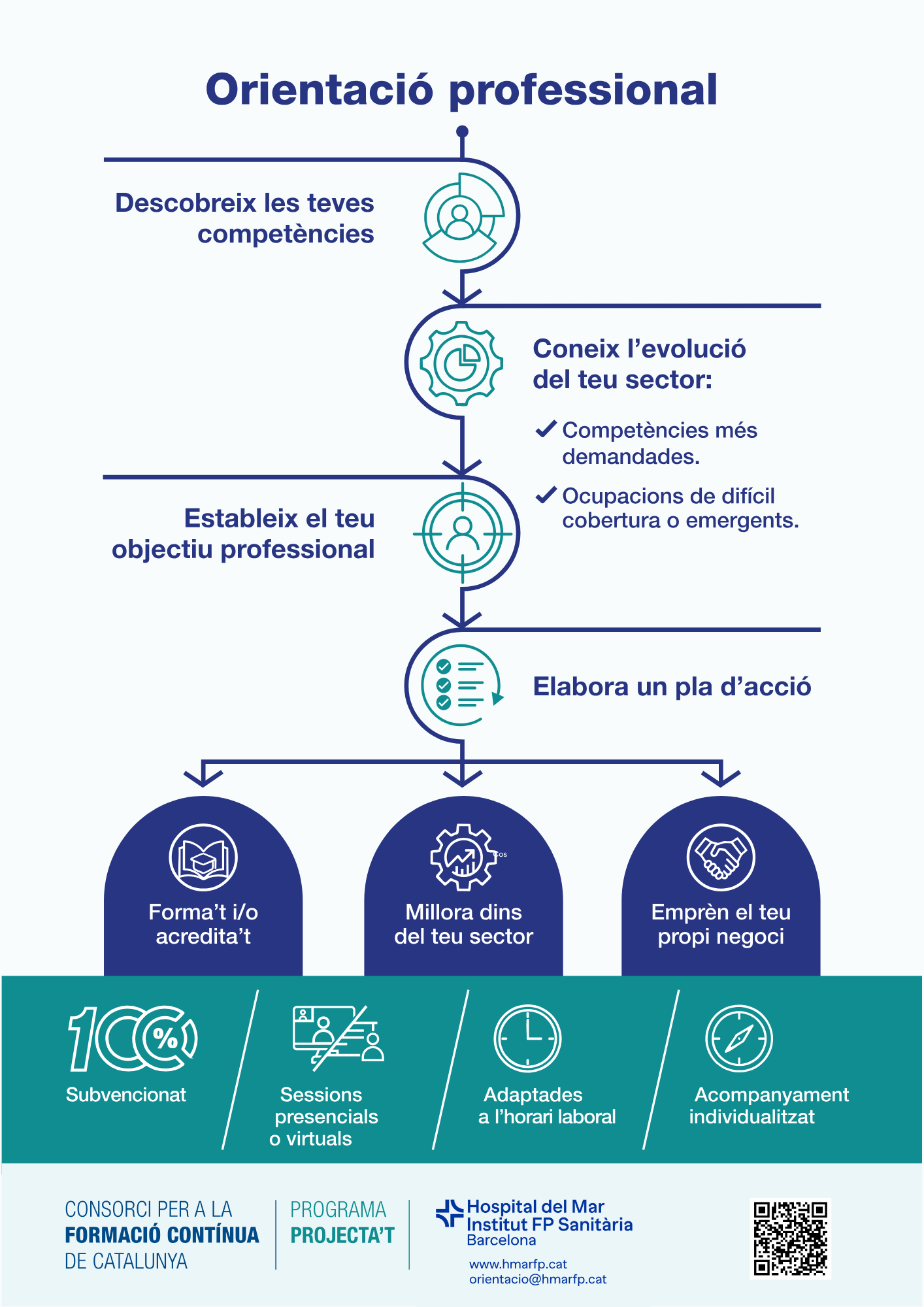 Des de l'Institut Hospital del Mar FP Sanitària posem en marxa aquest servei amb una mirada específica als sectors de la salut i de l'atenció a les persones i a les seves necessitats reals, oferint una orientació propera, personalitzada i especialitzada.
